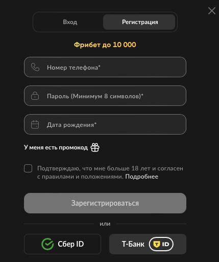 На главной странице в правом верхнем углу находится кнопка «Регистрация» в фирменном стиле букмекера. Нажатие открывает форму регистрации без перезагрузки страницы. Система предлагает два способа: через номер телефона или через онлайн-банкинг для автоматической идентификации.