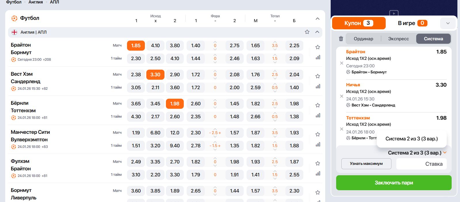 Выбор ставки типа система в купоне БК Винлайн