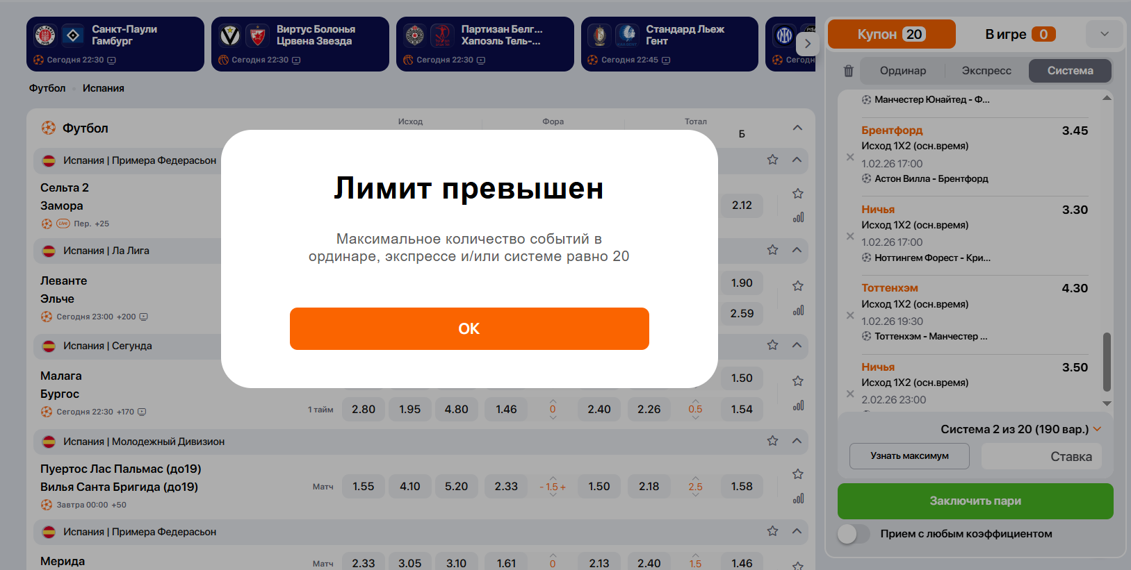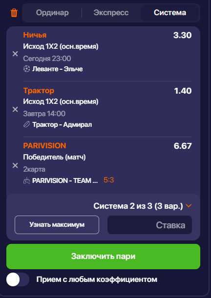Система позволяет комбинировать исходы из разных видов спорта в одном купоне, если они не зависят друг от друга.
